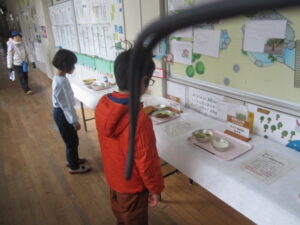 現在、職員室前には、過去の献立の模型を展示し、その歴史を目で見て感じ、当時の様子を思い浮かべたり、現在の豊かさを実感したりしています。また、休職中に、調理員さんや栄養教諭が各教室を訪問し、実際の調理器具を紹介したりしています。