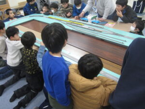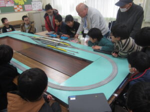 今回は、守山鉄道同好会の方に来ていただき、Nゲージを走らせていただきました。クラブ活動だけではもったいないので、昼休みには全校に開放しました。