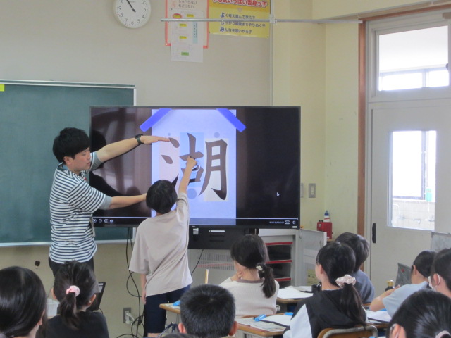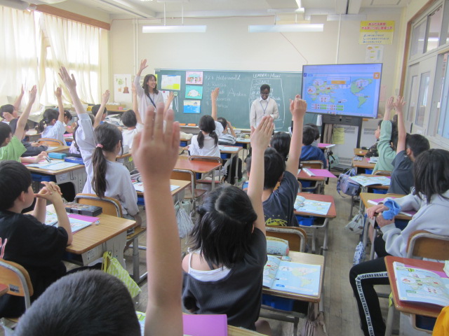 新学期が始まり、子どもたちは新しい環境にも少しずつ慣れ、毎日の学習を楽しみながら過ごしています。各教室を回ってみると、ALTの先生の質問に元気よく手を挙げる姿や、お手本をよく見て集中して習字に取り組む姿、また、学校司書の先生とともに図書室の使い方を学び、本の世界への広がりを感じている様子も見られました。各教室で、いろいろな授業が行われ、子どもたちの前向きな学びの姿が広がっています。