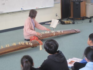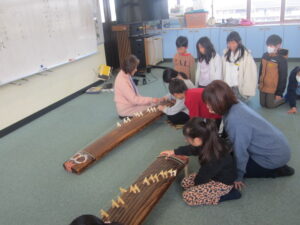 4年生が、吉身学区にお住いの大崎さんにお越しいただき、雅楽(お琴)の演奏体験をしました。